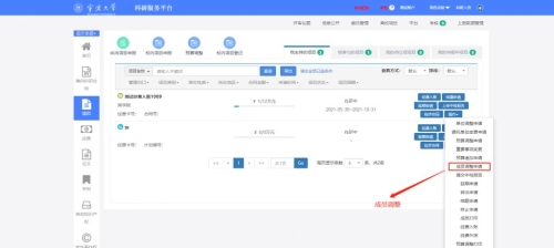 4. 进入项目组成员,请确认成员是否完整。特别是项目中有学生的参与的,请完善学生身份类别。成员信息有问题的,进入科研系统污污漫画,左侧的项目界面,点击操作下拉框下的成员调整申请,进入成员调整界面进行添加和修改,待项目主管审核之后,会自动补充到项目经费公开一览表,最后再提交即可。