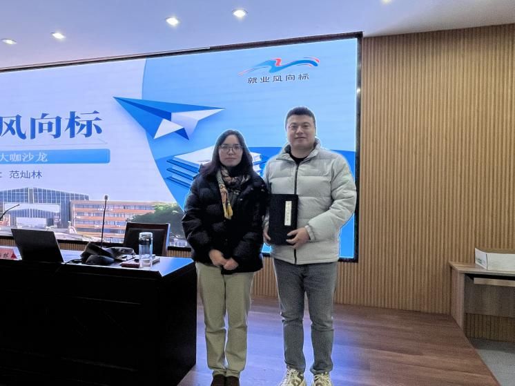 就业沙龙的尾声,胡秋丽老师对范灿林学长的分享做了总结,同时表达了对范学长远道而来的感激并赠予纪念品。