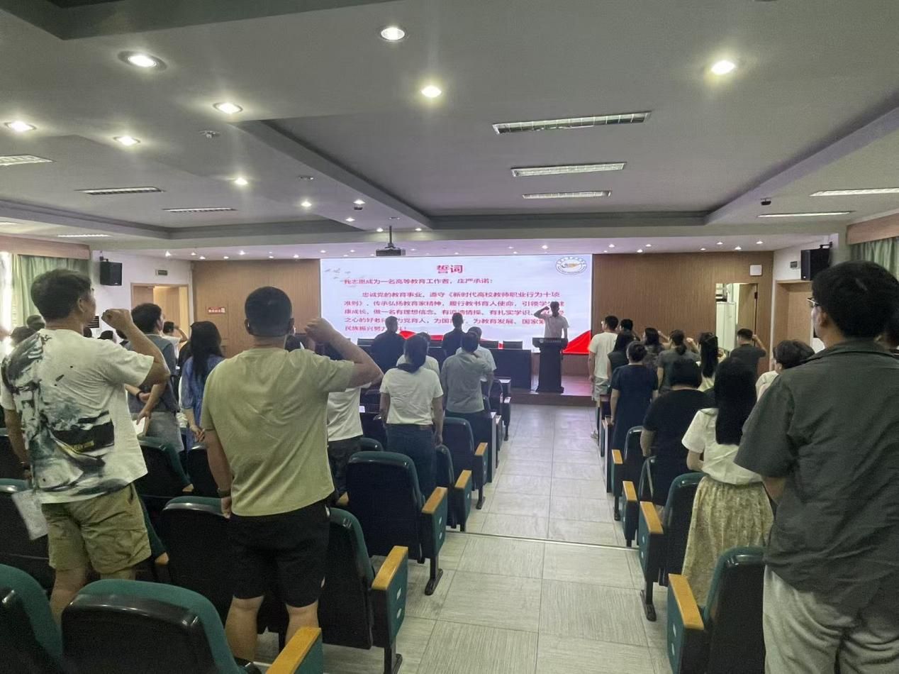 为持续强化教师队伍建设,会议专门设置了“开学师德第一课”环节。此举旨在深入推进师德师风建设,巩固拓展专项整治成果,不断完善师德养成的长效机制。在庄严的氛围中,新入职教师代表李楠带领全体教师进行了神圣的宣誓仪式。随后,全体教师现场签署了《污污漫画