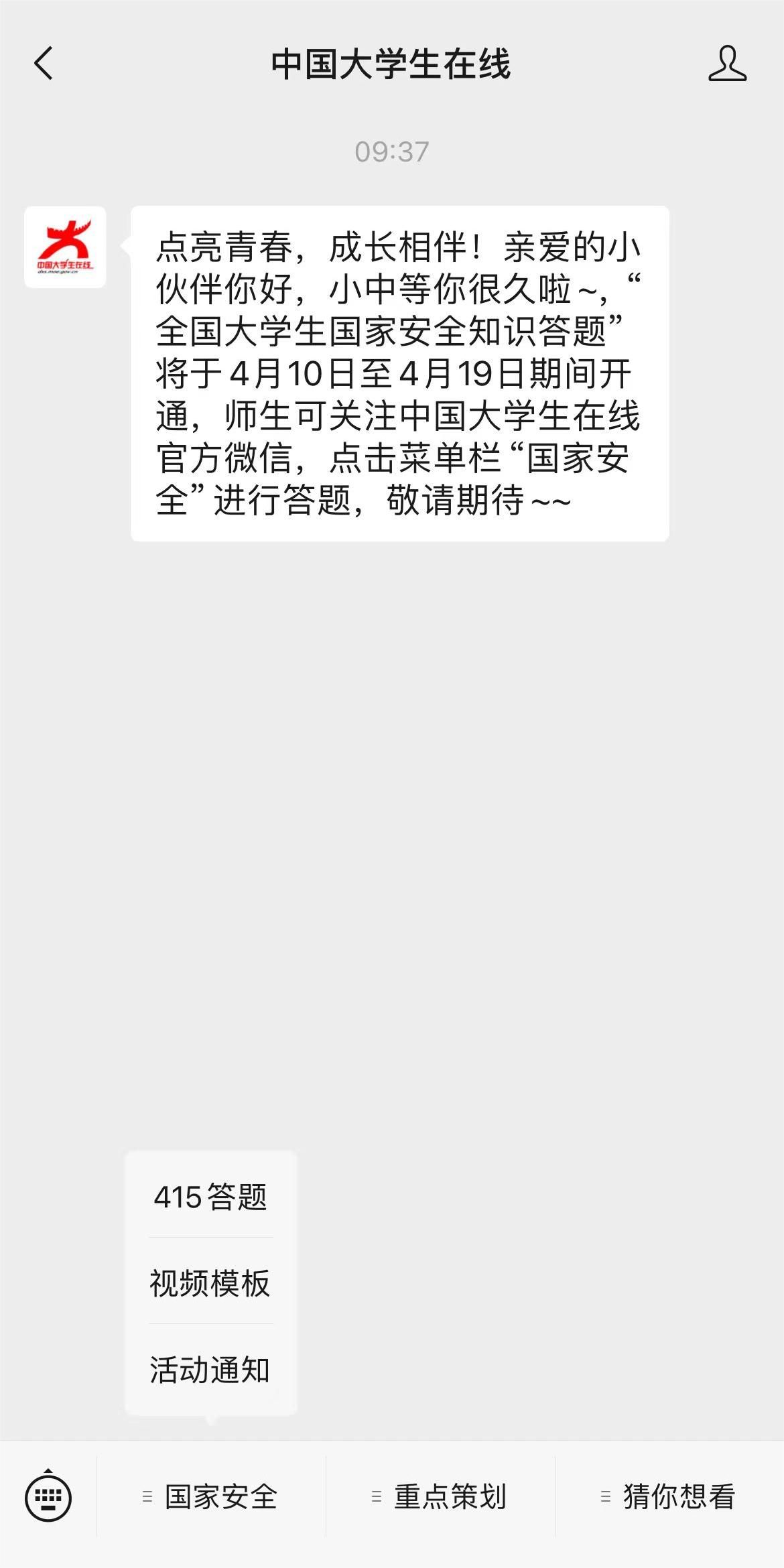 4、举办“全国大学生国家安全知识答题”活动。4月10日至4月19日期间,请师生通过中国大学生在线网站或微信公众号参与答题。(扫码进入微信公众号--国家安全--415答题)